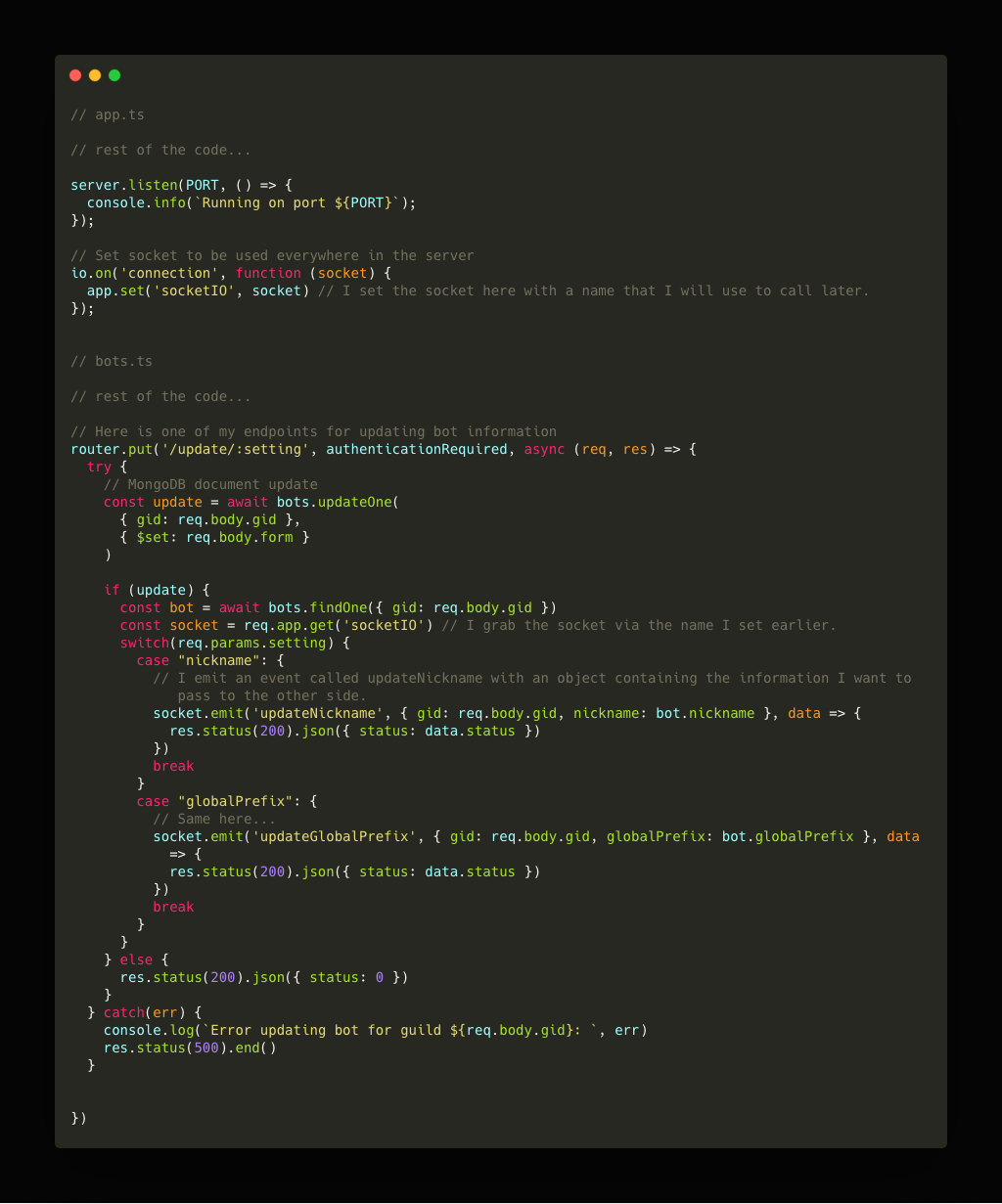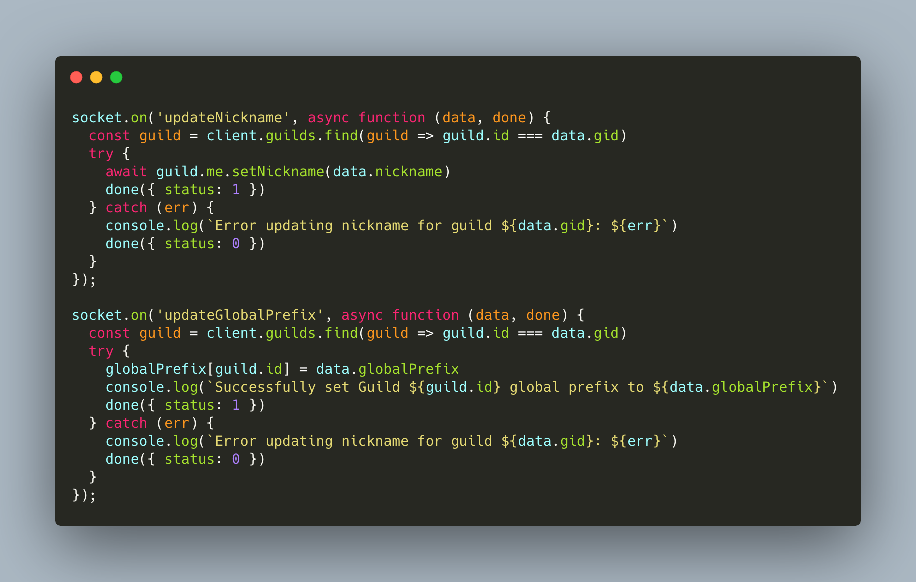 So to bring you guys up to speed, I've set up the dashboard, and have placed in the ability to change my Clientbot's nickname in one of my guilds in Discord. I do this by doing a PUT request to my API server and within the endpoint, it will update the document based on the body of the request. All good and dandy, sounds like it's done. But not quite...